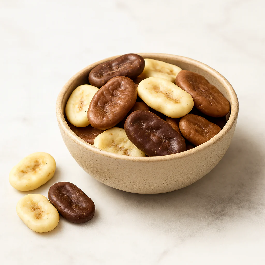 Knusprige Bananenchips, umhüllt von edler Schokolade – wahlweise in Zartbitter, Vollmilch oder Weiß. Diese tropische Leckerei vereint die Süße der Banane mit der Vielfalt köstlicher Schokoladensorten und bietet einen einzigartigen Genussmoment.