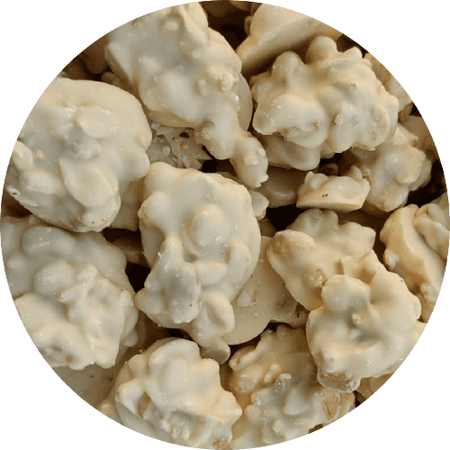 ERDNÜSSE (50 %), weiße Schokolade (Zucker, Kakaobutter, VollMILCHpulver, LAKTOSE (MILCH), MAGERMILCHpulver, Emulgator: E322 (SOJA), natürliches Vanillearoma) (50%)