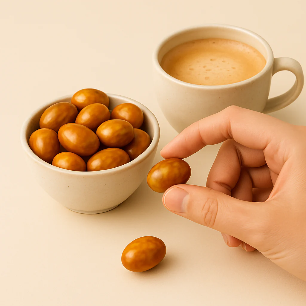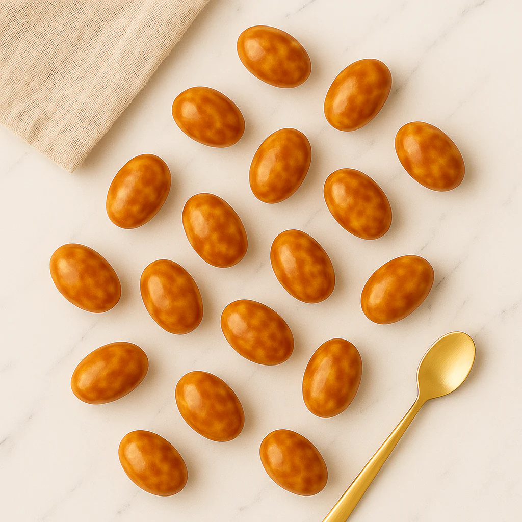 Knackige Mandeln, umhüllt von feinster Milchschokolade und verfeinert mit dem köstlichen Geschmack von Tiramisu. Ein Hauch weißer Schokolade rundet diese edle Spezialität ab und macht sie zu einem luxuriösen Genussmoment für echte Feinschmecker.