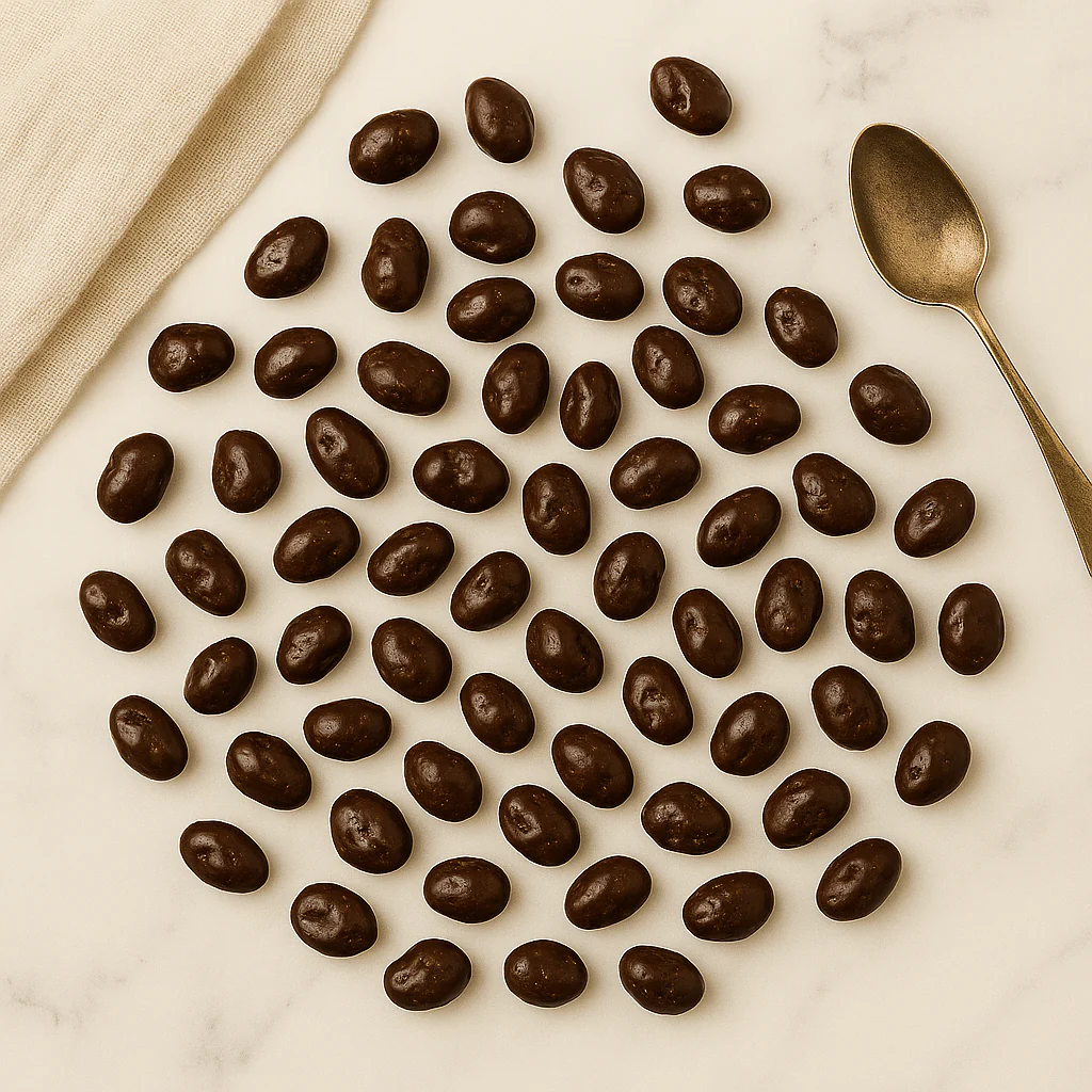 Saftige Rosinen, umhüllt von edler Zartbitterschokolade – die perfekte Kombination aus fruchtiger Süße und intensivem Schokoladenaroma. Ein köstlicher Snack für jede Gelegenheit.